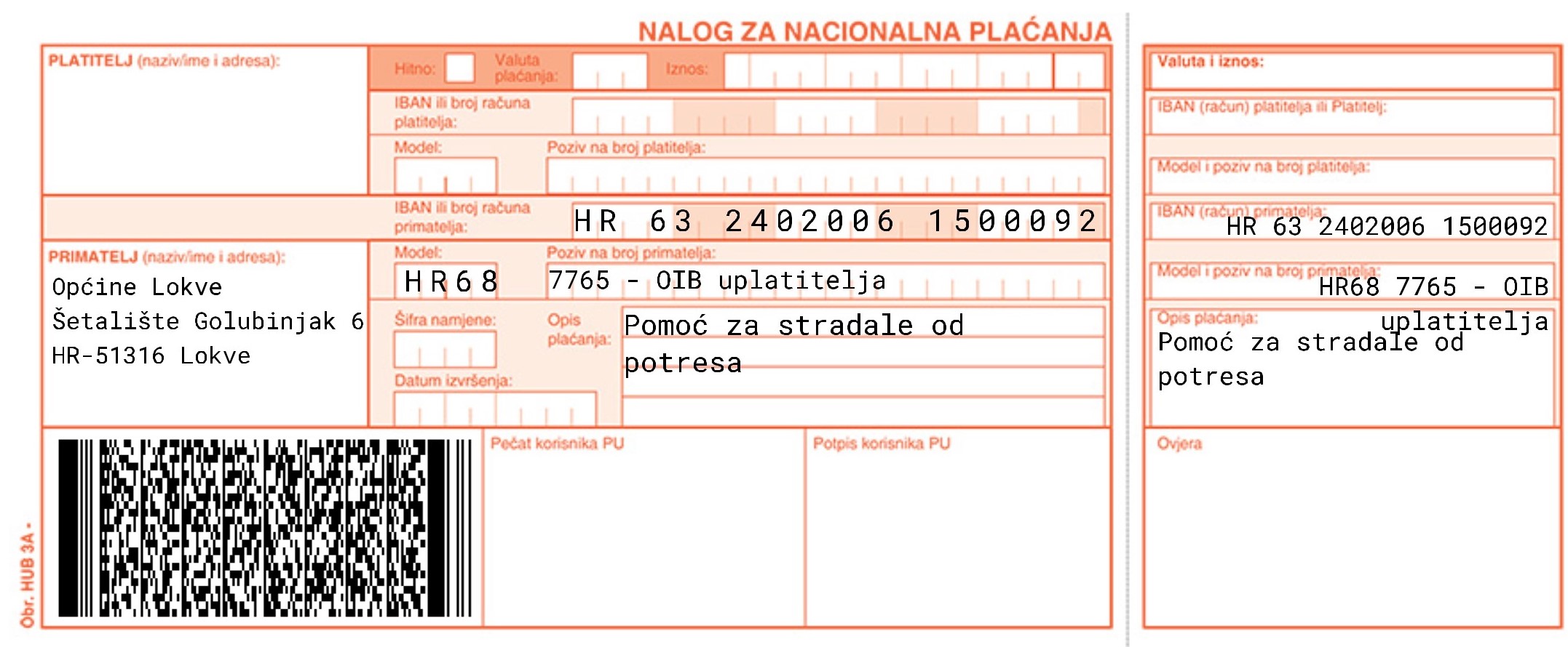 Napomena: Svi oni koji nisu u mogućnosti uplatiti donaciju direktno na račun mogu svoje novčane priloge donijeti u zgradu općine te ćemo uplatu mi izvršiti.