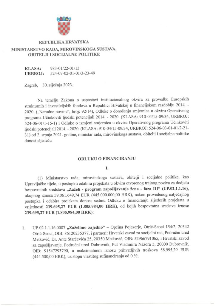 02.03.2023 Općinski načelnik ZAŽELI - Žene u ruralnoj zajednici Zaželi – Program zapošljavanja žena – faza III Zaželi – Program zapošljavanja žena – faza III, Operativnog programa ULJP 2014.-2020 Vrijednost: 52.335,79 eura ← Prethodna Rekonstrukcija i dogradnja sportske dvorane Sljedeća → POZIV ZA RAD – STUDENTI