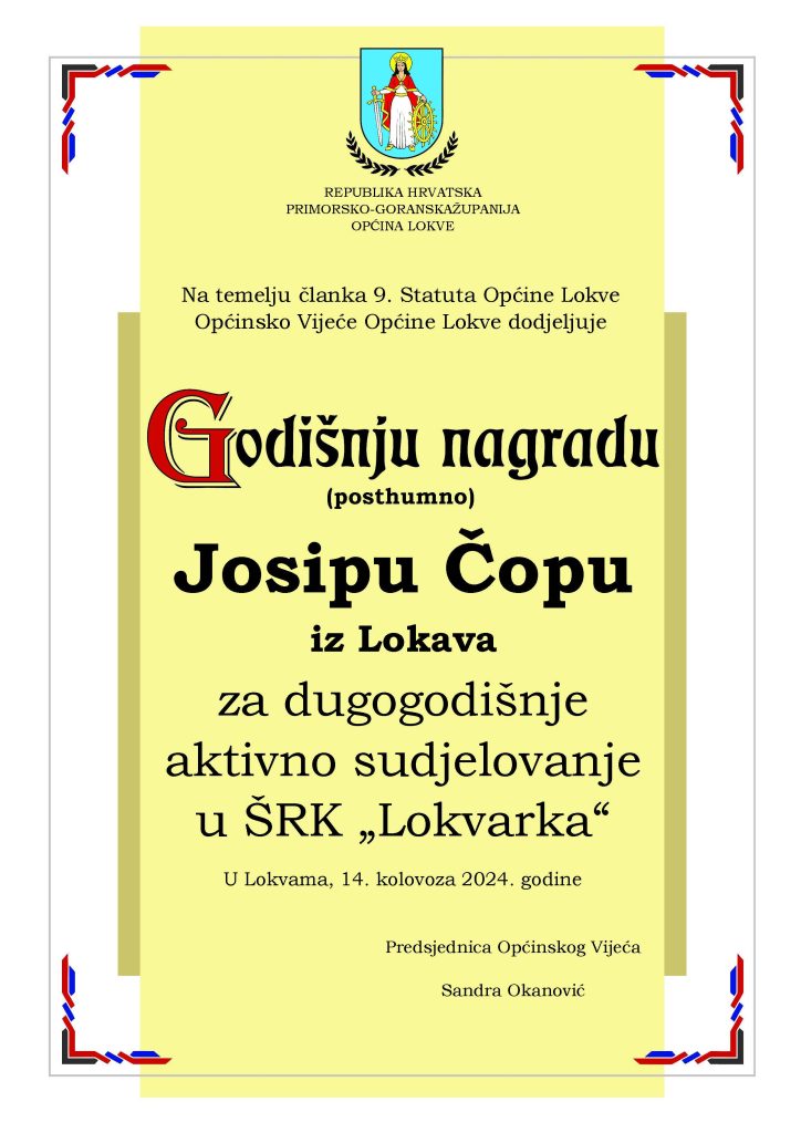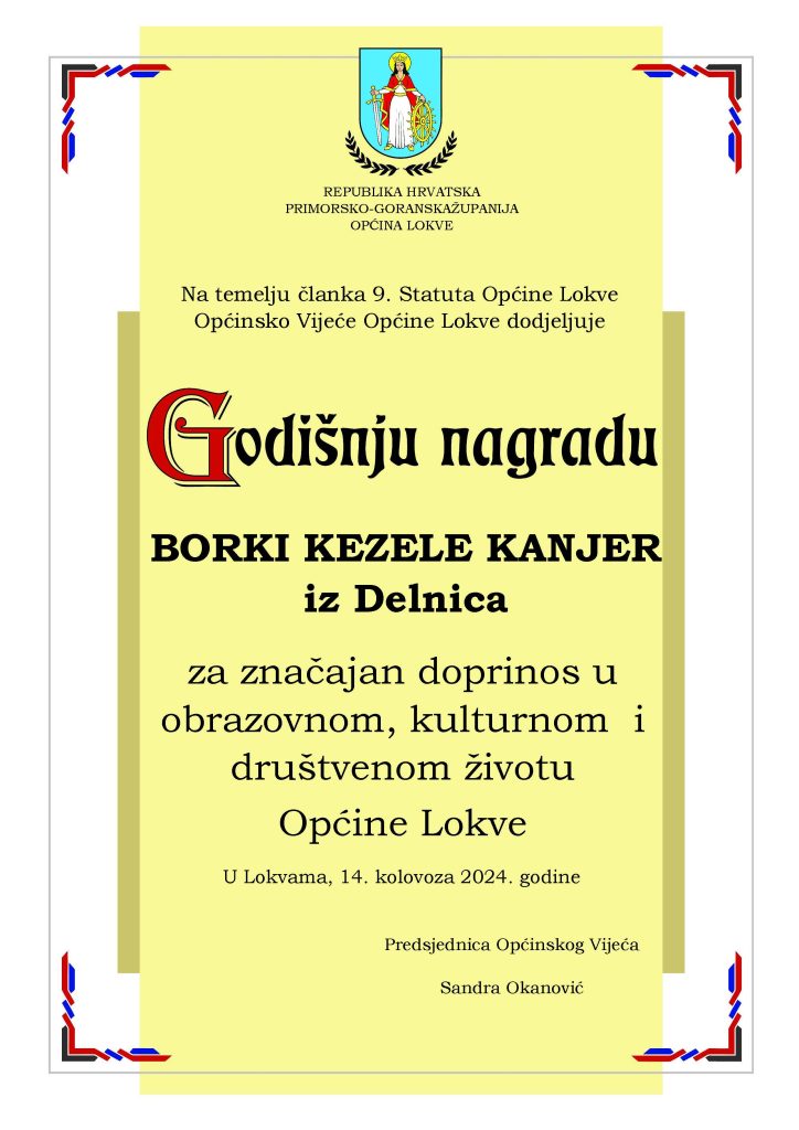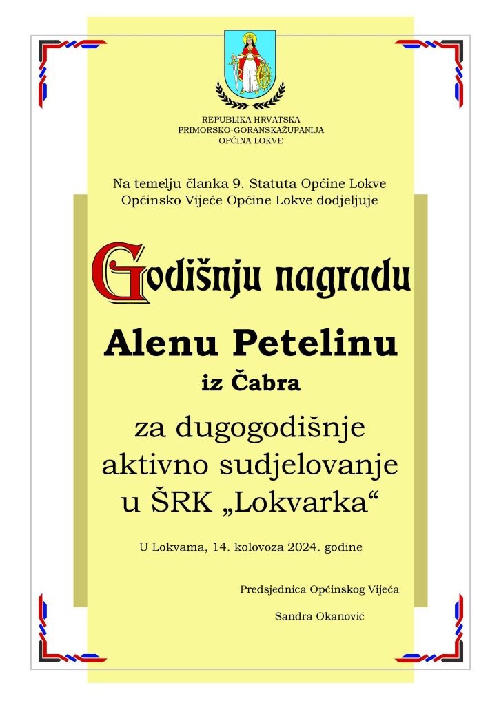 Isto su tako zasluženi pljesak zaradili i dobitnici godišnjih nagrada. Za dugi niz godina rada u prosvjeti, točnije u OŠ Rudolfa Strohala, godišnju je nagradu primila Borka Kezele Kanjer. Alen Petelin isto je priznanje dobio za dugogodišnji rad u Športsko-ribolovnom klubu Lokvarka, a posthumno je godišnja nagrada uručena i obitelji Josipa Čopa, također člana ŠRK-a Lokvarka. Uz ove tri nagrade dodijeljene su i zahvalnice koje su dobili madi Lokvarci koji su ove godine dali veliki doprinos brojnim aktivnostima u mjestu. To su Adrian Javor, Bartol Bašić, Fran Žagar, Marko Čop, Mateo Troha, Vito Francišković, Alen Cenčić, Ana Jakovac, Dora Hodak, Ines Dabo, Mia Čop, Nora Čop, Patricia Marković, Johana Štimac, Dorian Baričević, Stjepan Čop i Krsto Tonković.