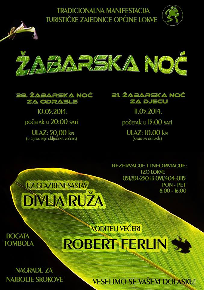 Ovaj vikend svibnja, dakle 10. i 11. svibnja, bit će u Lokvama održana 38. po redu Žabarska noć, nadaleko poznata originalna priredba kojom Lokvarci kroz natjecanje u žabljim skokovima promoviraju svoj kraj i njegove posebnosti. Nimalo ne treba sumnjati da će i ovom prigodom biti zanimljivo i zabavno, a da svi uživaju pobrinut će se ove godine grupa Divlja ruža i voditelj Robert Ferlin.