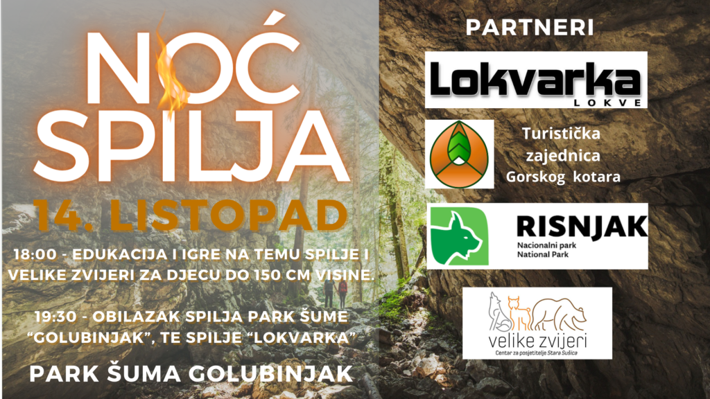 Noć spilja 2023. počinje 14.10.2022.-subota u 18:00 sati ispred restorana u Park šumi Golubinjak kada počinje edukacija i igre na temu spilje i velike zvijeri za djecu do 150 cm visine u suradnji sa NP Risnjak i Javnom ustanovom Priroda PGŽ (Glazba, nagrade, traženje divljih zvijeri…)