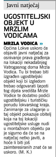 31.05.2016 Općinski načelnik Lokve u medijima , Vijesti Novi list – ugostiteljski objekt Mrzla vodica ← Prethodna Novi list – Poznati ruski ulagač nakon vikendice kupio i Motel Jezero Sljedeća → Novi lsit – započela 37. Goranska kiparska radionica