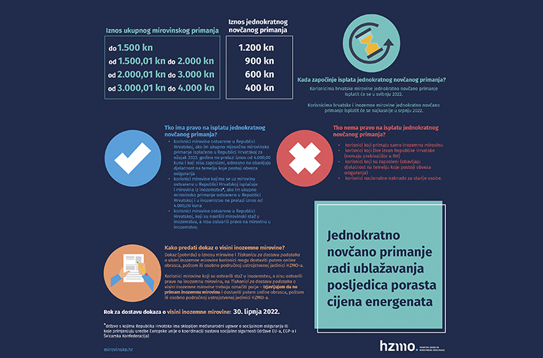 - korisnici mirovine ostvarene u Republici Hrvatskoj, ako im ukupno mjesečno mirovinsko primanje isplaćeno u Republici Hrvatskoj za ožujak 2022. godine ne prelazi iznos od 4.000,00 kuna i koji nisu zaposleni, odnosno ne obavljaju djelatnost na temelju koje postoji obveza osiguranja