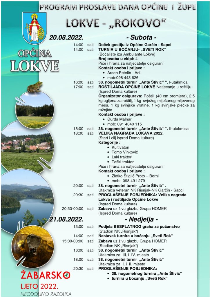 15.08.2022 Općinski načelnik Vijesti Program proslave dana Općine i župe Lokve – ROKOVO Sveta misa povodom blagdana Svetoga Roka održati će se 16.8.2022. srijeda u 18:00 sati u crkvi Svete Katarine u Lokvama. ← Prethodna Svečana sjednica Općine Lokve 2022. Sljedeća → Summer Amadeus Night – NL
